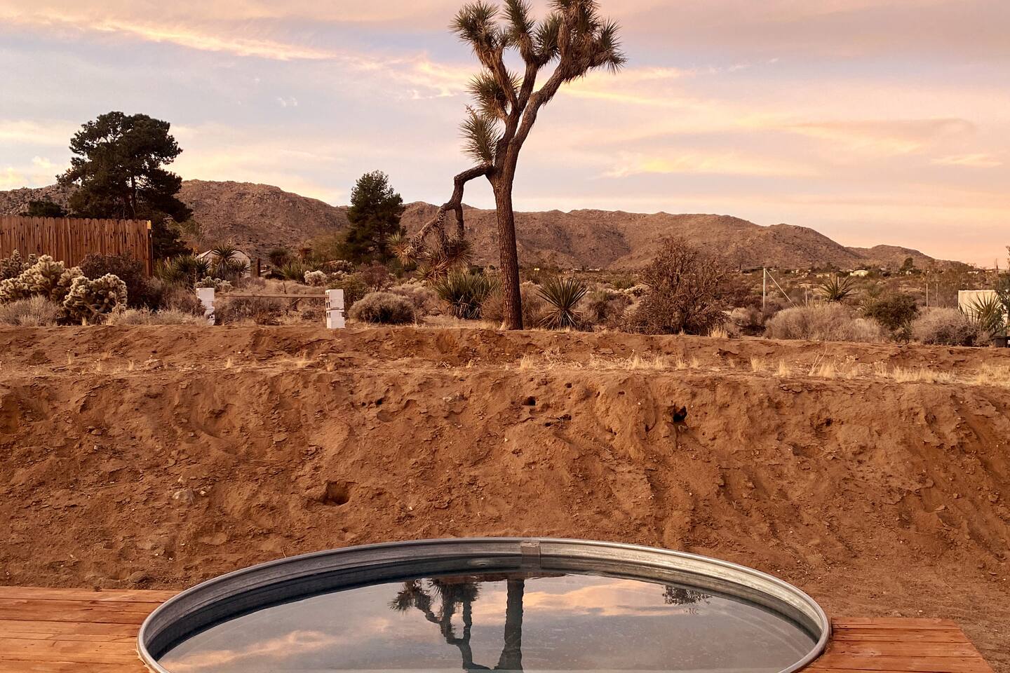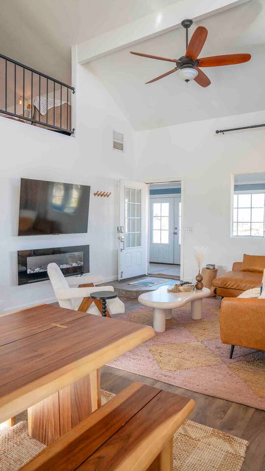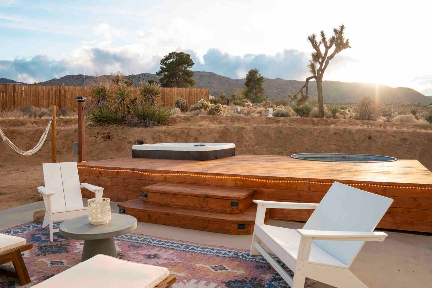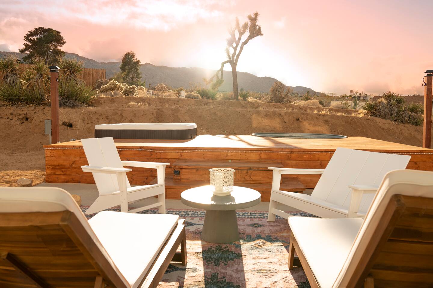 ✌︎ Features at a Glance ✌︎ ⎯Professionally designed interiors ⎯360° desert views, sunrises, and sunsets ⎯Heated spa 24/7 ⎯Cowboy pool for cooling ⎯Loft king suite with spiral staircase ⎯Private king bedroom with attached half bath ⎯Office with pullout bed for additional guests ⎯Multiple outdoor seating areas for sunrise, sunset, and stargazing ⎯Wraparound covered porch with yoga space and indoor-outdoor sleeping ⎯Swing set, hammocks, firepit, cornhole, and giant Jenga ⎯Telescope for stargazing ⎯65” Smart TV with fireplace ⎯Fully equipped kitchen with local Joshua Tree coffee ⎯Powerful heating & AC in each room ⎯Dogs welcome (see details below) The Desert Julep is newly remodeled and professionally designed in a dreamy, California desert style with natural elements and luxury vibes that highlight the magic of the high desert. Bright, airy, and infused with desert-inspired décor, the home features twenty-foot ceilings, abundant natural light, and a seamless indoor-outdoor flow. The expansive, breezy, and covered wraparound porch offers uninterrupted views and is one of a kind — perfect for indoor-outdoor sleeping, yoga, or dining. Step outside to swing under the sunrise, sit by the fire, soak in the spa or cowboy pool while watching the sun set, or stargaze from the hammocks. Desert Julep is perched on a hilltop where Joshua Tree’s beauty surrounds you from every angle. Step inside to an open-concept living and dining area with a fully equipped kitchen, comfortable seating, a 65” smart TV, and an electric fireplace. Guests love the peaceful nooks for reading, board games, or simply enjoying the desert scenery through expansive windows. ⛺︎ Bedrooms & Bathrooms ⛺︎ Rest deeply in two king bedrooms, including our loft suite with sunrise views from bed. A spiral staircase connects the loft to the office, which serves as an additional sleeping area with a pullout bed. Each bedroom is outfitted with premium bedding, soft organic sheets, and cozy pillows. The main bathroom features a soaking tub with Joshua Tree views, bath salts, and bubble bath for a spa-like experience. A half-bath off the first-floor bedroom adds convenience and includes laundry facilities. ☀︎ Outdoor Oasis ☀︎ Desert Julep’s outdoor space is a true desert playground with multiple seating areas designed for sunrises, sunsets, and stargazing: ⎯Sunrise spots: swing set, wraparound porch, firepit, hammocks ⎯Sunset spots: pool and spa and hammocks too ⎯Stargazing spots: everywhere, with hammocks as a favorite ⎯Cowboy pool (for cooling) and 24/7 heated spa ⎯Swing set and hammocks ⎯Telescope for stargazing ⎯Firepit & BBQ ⎯Cornhole and giant Jenga ⎯Wraparound covered porch with dining, yoga space, and breezy Mojave Desert views Ready to experience the magic at Desert Julep? Reserve your dates today before they’re gone! Still thinking it over? Tap the ❤ to save and come back anytime. Staying at Desert Julep isn’t just about finding a place to sleep — it’s about immersing yourself in the desert. Every detail, from sunrise views to stargazing through the telescope, has been designed to create a memorable experience. Having grown up in the desert, gotten engaged and married here, and then buying this forever home, we’re committed to making your trip to Joshua Tree unforgettable too.