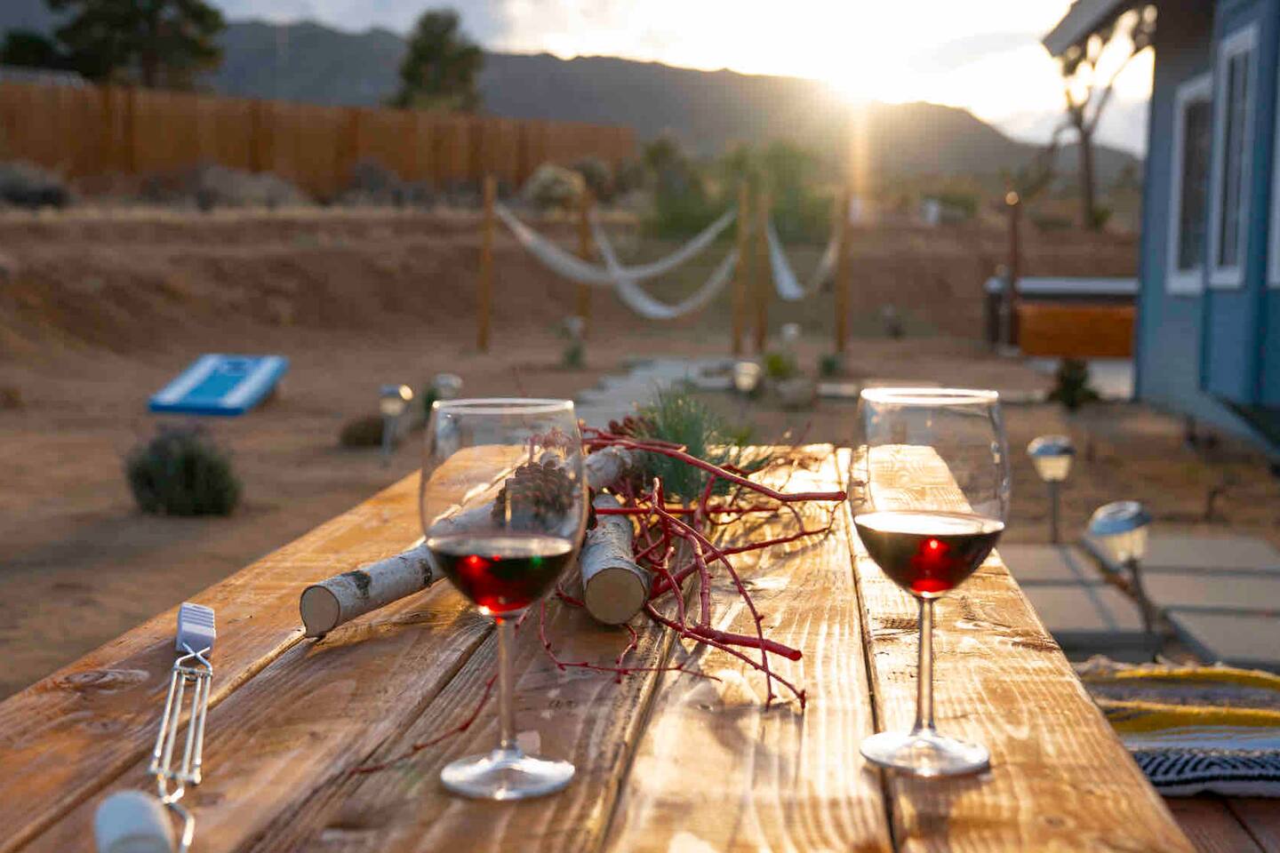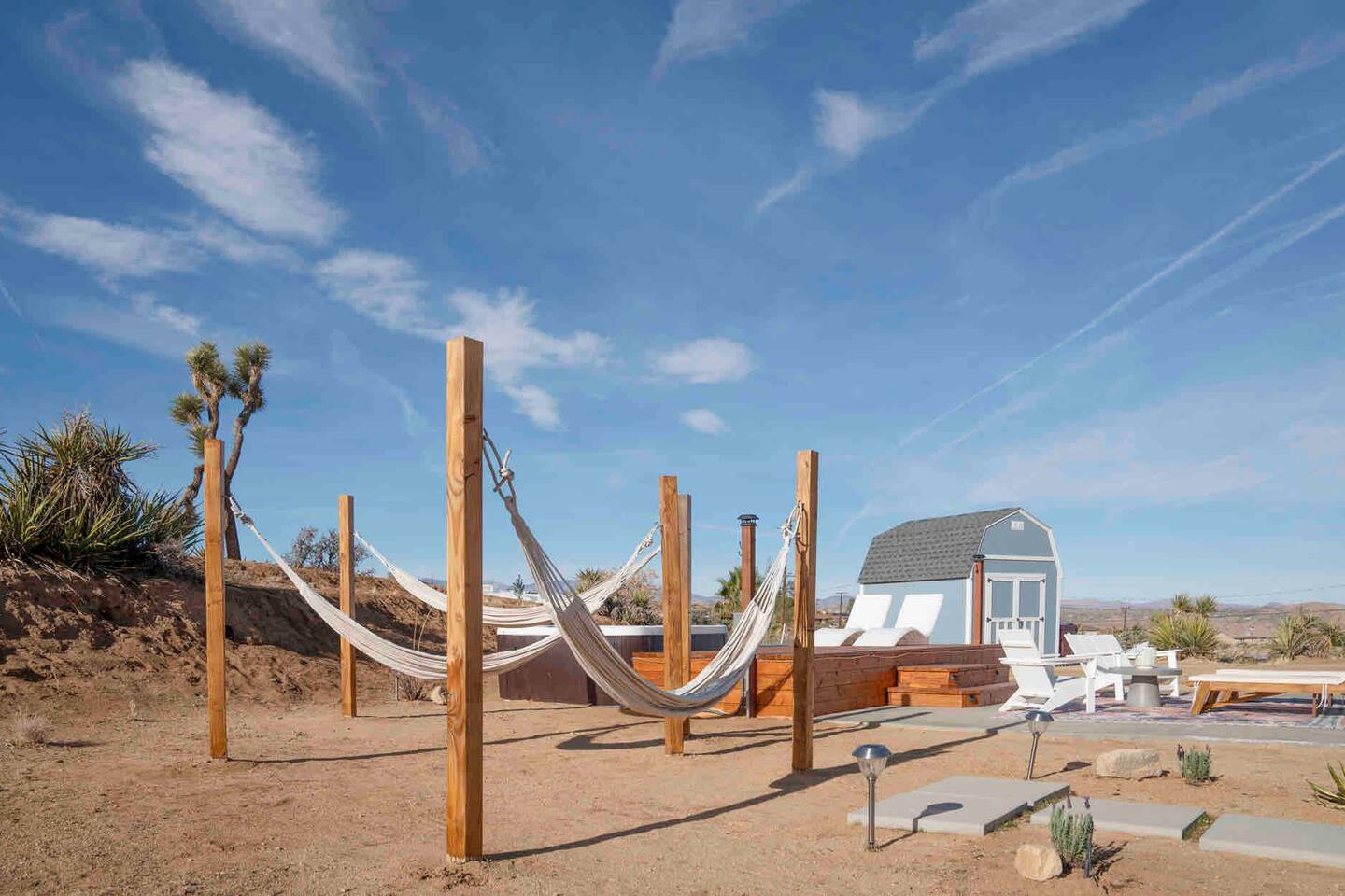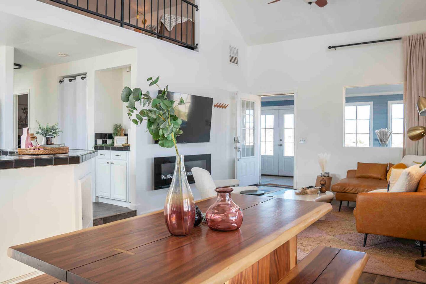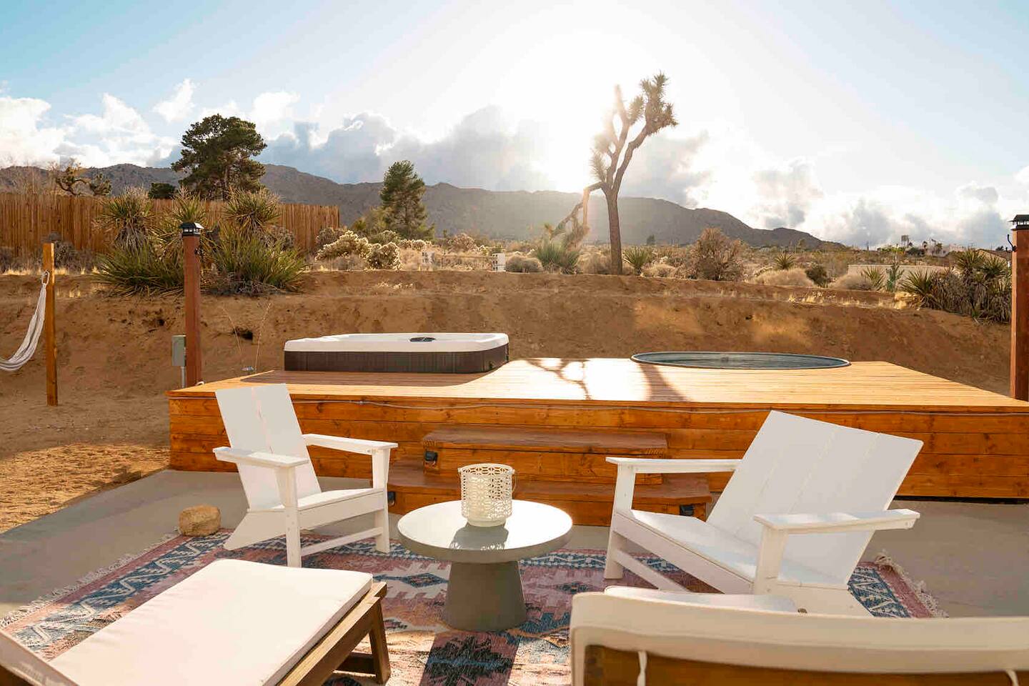 ✌︎ Features at a Glance ✌︎ ⎯Professionally designed interiors ⎯360° desert views, sunrises, and sunsets ⎯Heated spa 24/7 ⎯Cowboy pool for cooling ⎯Loft king suite with spiral staircase ⎯Private king bedroom with attached half bath ⎯Office with pullout bed for additional guests ⎯Multiple outdoor seating areas for sunrise, sunset, and stargazing ⎯Wraparound covered porch with yoga space and indoor-outdoor sleeping ⎯Swing set, hammocks, firepit, cornhole, and giant Jenga ⎯Telescope for stargazing ⎯65” Smart TV with fireplace ⎯Fully equipped kitchen with local Joshua Tree coffee ⎯Powerful heating & AC in each room ⎯Dogs welcome (see details below) The Desert Julep is newly remodeled and professionally designed in a dreamy, California desert style with natural elements and luxury vibes that highlight the magic of the high desert. Bright, airy, and infused with desert-inspired décor, the home features twenty-foot ceilings, abundant natural light, and a seamless indoor-outdoor flow. The expansive, breezy, and covered wraparound porch offers uninterrupted views and is one of a kind — perfect for indoor-outdoor sleeping, yoga, or dining. Step outside to swing under the sunrise, sit by the fire, soak in the spa or cowboy pool while watching the sun set, or stargaze from the hammocks. Desert Julep is perched on a hilltop where Joshua Tree’s beauty surrounds you from every angle. Step inside to an open-concept living and dining area with a fully equipped kitchen, comfortable seating, a 65” smart TV, and an electric fireplace. Guests love the peaceful nooks for reading, board games, or simply enjoying the desert scenery through expansive windows. ⛺︎ Bedrooms & Bathrooms ⛺︎ Rest deeply in two king bedrooms, including our loft suite with sunrise views from bed. A spiral staircase connects the loft to the office, which serves as an additional sleeping area with a pullout bed. Each bedroom is outfitted with premium bedding, soft organic sheets, and cozy pillows. The main bathroom features a soaking tub with Joshua Tree views, bath salts, and bubble bath for a spa-like experience. A half-bath off the first-floor bedroom adds convenience and includes laundry facilities. ☀︎ Outdoor Oasis ☀︎ Desert Julep’s outdoor space is a true desert playground with multiple seating areas designed for sunrises, sunsets, and stargazing: ⎯Sunrise spots: swing set, wraparound porch, firepit, hammocks ⎯Sunset spots: pool and spa and hammocks too ⎯Stargazing spots: everywhere, with hammocks as a favorite ⎯Cowboy pool (for cooling) and 24/7 heated spa ⎯Swing set and hammocks ⎯Telescope for stargazing ⎯Firepit & BBQ ⎯Cornhole and giant Jenga ⎯Wraparound covered porch with dining, yoga space, and breezy Mojave Desert views Ready to experience the magic at Desert Julep? Reserve your dates today before they’re gone! Still thinking it over? Tap the ❤ to save and come back anytime. Staying at Desert Julep isn’t just about finding a place to sleep — it’s about immersing yourself in the desert. Every detail, from sunrise views to stargazing through the telescope, has been designed to create a memorable experience. Having grown up in the desert, gotten engaged and married here, and then buying this forever home, we’re committed to making your trip to Joshua Tree unforgettable too.